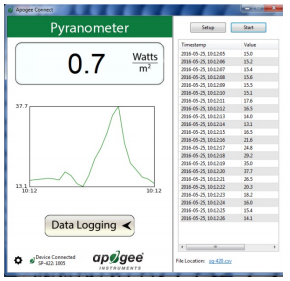 SP-420還內(nèi)置數(shù)據(jù)存儲芯片,無需其他記錄儀或計算機(jī),即可自動記錄10000個測量數(shù)據(jù),方便了您的使用。傳感器電纜標(biāo)配USB 2.0接口,可以方便地連接各種類型的電腦。通過配備的Apogee軟件即可輕松對測量數(shù)據(jù)進(jìn)行實時顯示數(shù)據(jù)圖形。它還創(chuàng)新性地采用了5V DC USB供電方式,使其工作方式異常多樣性,您不僅可以將其直接插到計算機(jī)的USB接口上,還可以通過普通的USB電源適配器來直接使用220V交流電,您甚至可以使用移動設(shè)備常用的移動電源(充電寶)為其提供工作電力。
