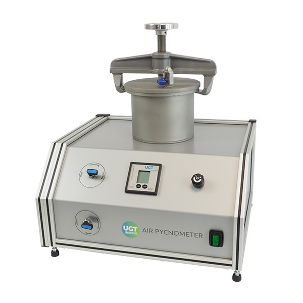 儀器由外置樣品室、與樣品室相聯(lián)通的內(nèi)置壓力室及數(shù)字氣壓計等組成。測量前需要先對壓力室的體積和樣品室的體積(盛放土壤樣品的容器如取樣環(huán)等必須放入樣品室內(nèi))進(jìn)行校準(zhǔn):先測量壓力室與樣品室聯(lián)通平衡前后的壓力變化,再將已知體積的校準(zhǔn)塊(可用已知體積的砝碼等)放人樣品室重新測量壓力室與樣品室聯(lián)通平衡前后的壓力變化,即可完成對壓力室和樣品室體積的校準(zhǔn)。土壤樣品經(jīng)干燥稱重后(如此可以得出土壤含水量)放入樣品室,打開壓力室與樣品室聯(lián)通閥,測量氣體平衡前后的壓力變化。最終通過所附的Excell文檔,即可得出土壤空隙度、pF等于1.8時的土壤空隙或田間持水量、土壤飽和持水量等,而且可以根據(jù)下面公式得出土壤三相比: